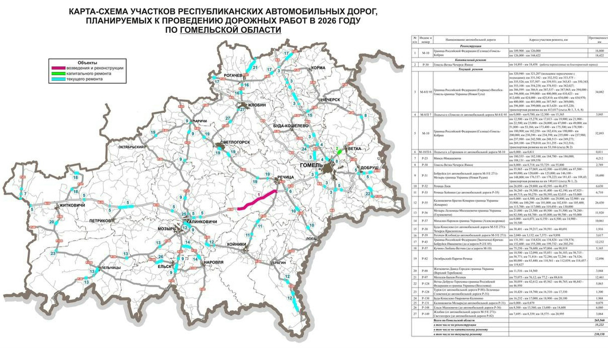 РУП «Гомельавтодор» опубликовал карту-схему участков республиканских автомобильных дорог, планируемых к проведению дорожных работ в 2026 году по Гомельской области.